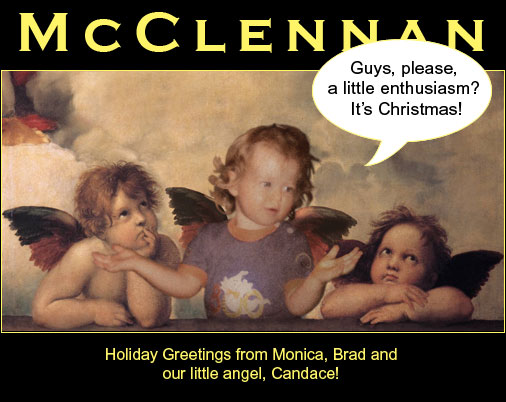 | Used in a mass Christmas e-mail. Testament to the adage that all art is never finished, but instead abandoned. I could have kept working on this till the child from the snapshot was indiscernible in style from her cherubian counterparts, but time would not allow. Painting is Rafael's Angels. |