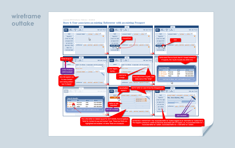 The Dev team were champing at the bit to get coding, but they were digesting my documentation too slowly. For some, English was their second language. But mostly they were becoming overwhelmed by the kind of classically thorough wireframes I was delivering. Time to get creative: In accordance with the "Pareto Principle," otherwise known as the 80/20 rule, I came up with what I call "Storyboard Wireframes." These illustrated a single User story on one page, using nine "panels" or less. By very simply illustrating the core 20% of the User's experience, we were able to make much greater progress in much less time. The video clip here shows the production code that resulted from this wireframe.