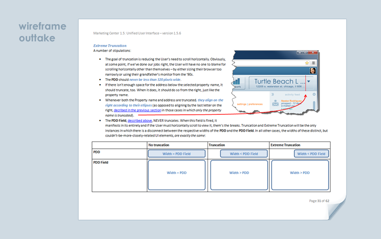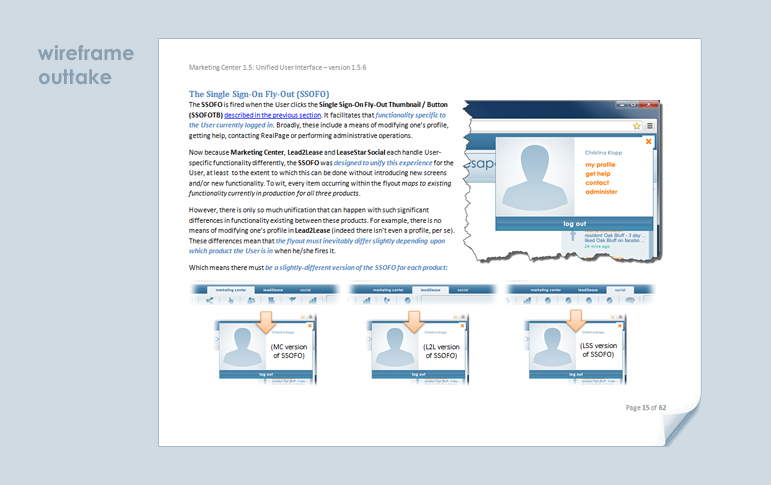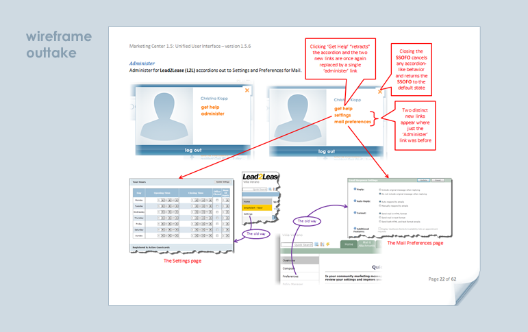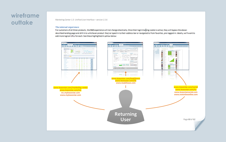 In the spring of 2013 I was tapped to unify the experience of three discrete legacy applications in to one SaaS enterprise suite. Clients would be in attendance at the annual company-wide mid-summer expo and we had to convince them - as well as Wall Street - that such an undertaking was something my employer, RealPage, could pull off with the resources we had in place. The suite didn't need to be completely engineered for summer. It just needed to prove that a phased solution could still serve the three distinct User-bases while such engineering was in progress. So my first job was to get every single stakeholder looking at the same document so there could be no confusion. The document had to serve as a wireframe, as a strategy document and as an educational tool. We met our goal for summer and this is the document that helped us do it.
