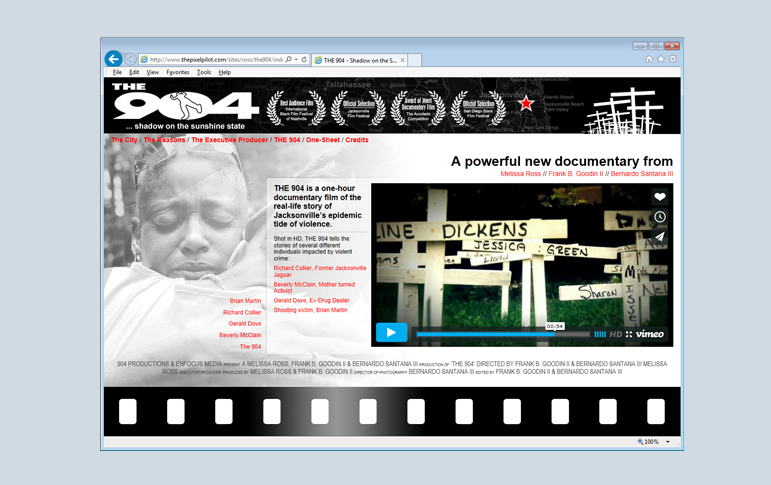 In 2010, my first and favorite freelance client, radio personality Melissa Ross needed a Web-site to promote the award-winning independenet film she produced about the epidemic of gun violence in her home town of Jacksonville, Florida. Together we decided the User should never be without access to the film's trailer, so the site's content unfolds around it using good old-fashioned framesets. In an effort to keep this job on-budget, I divined a color palette for the brand that both saved me time and saved her money at the printer -- all while effectively connoting the stark nature of the material.