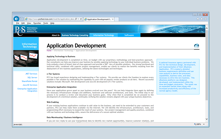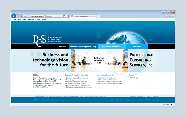 While employed as a consultant for Professional Consulting Services, I designed, coded and "Webmastered" two internal Web-sites as well as a Movable Type blog. This site served as the corporate online presence for PCS and amazingly, still does some nine years after it was built ( as of 2014 )! I also created the 3D imagery appearing on many of the pages.