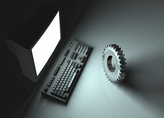 | Meant to convey a convergence of IT and real-world machine assets, an excellent example of the power of quality rendering and how it can often save a marketing campaign the expense of hiring a photographer. Note how the computer keyboard is reflected in the polished outer edge of the gear face. |