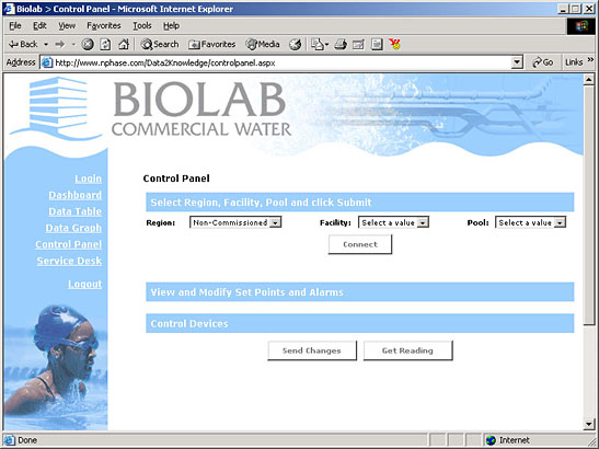 | This is screenshot from the actual application was typical of an overall look-and-feel developed to express the app's purpose on every page. This purpose was to remotely monitor and manage man-made bodies of water like fountains and swimming pools. |